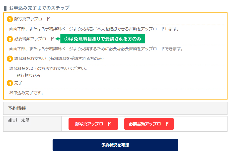 | ● | 免除科目有りで受講される方や、資格証明書類が必要な講習を受講される方はアップロードしてください。 |